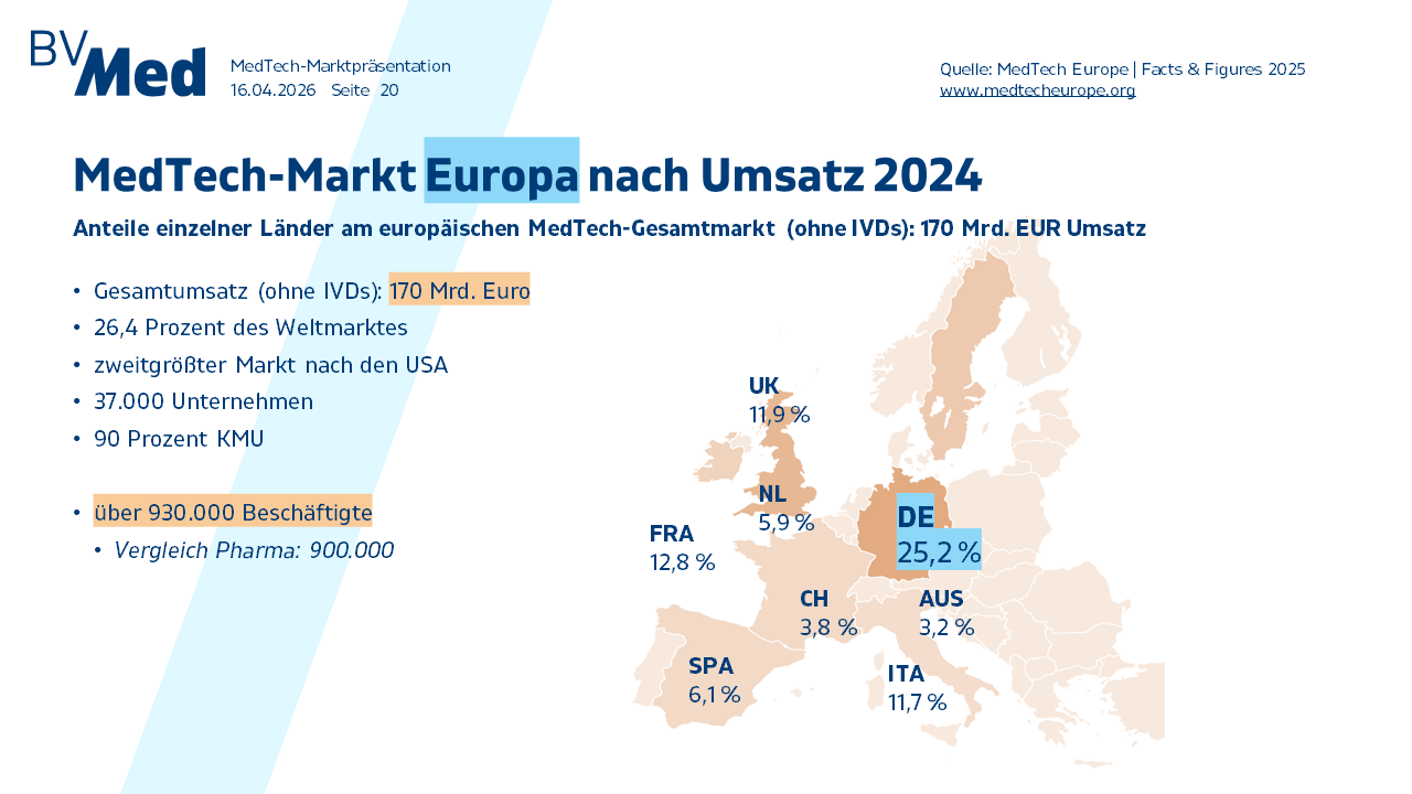 Die EU ist nach den USA der zweigrößte Markt für Medizintechnik der Welt. Der Umsatz beträgt 170 Milliarden Euro (Stand: 2024). Das sind über 26 Prozent des Weltmarkts. Die rund 37.000 MedTech-Unternehmen in Europa beschäftigen insgesamt über 930.000 Menschen. 90 Prozent der Unternehmen sind KMU.